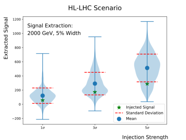 如图所示,在假设的高亮度LHC条件下,该方法仍能很好地提取出注入的信号。