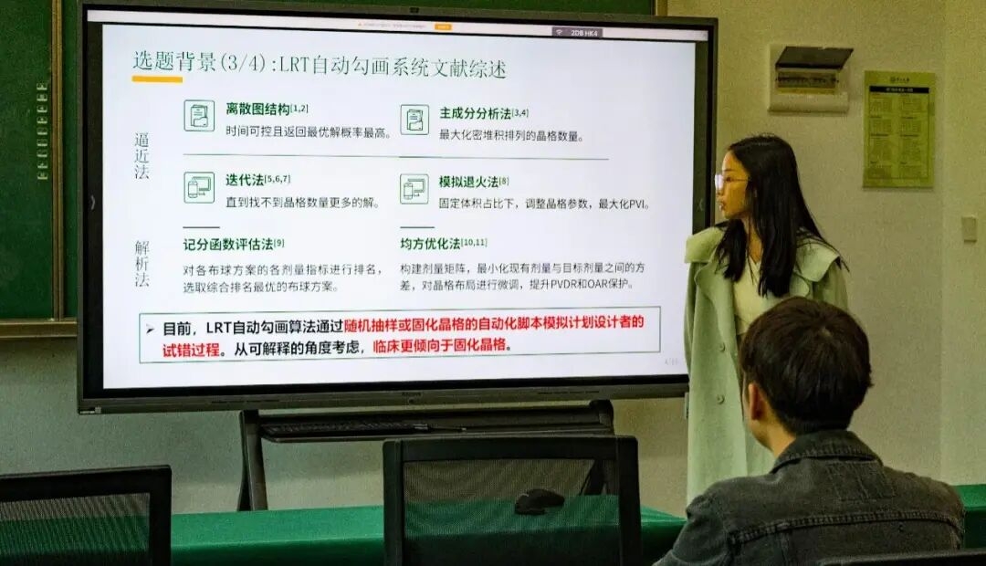 2024级硕士研究生戴安娜聚焦光子三维晶格放疗技术,分享了《光子三维晶格放疗自动勾画系统适形优化技术》的研究成果。她提出的“肿瘤中轴引导+遗传算法”自动化脚本,有效减少了计划设计者手动勾画小球的时间成本,同时确保不同放疗中心的计划质量趋于统一,为患者获得安全高效的放射治疗提供了技术支撑。