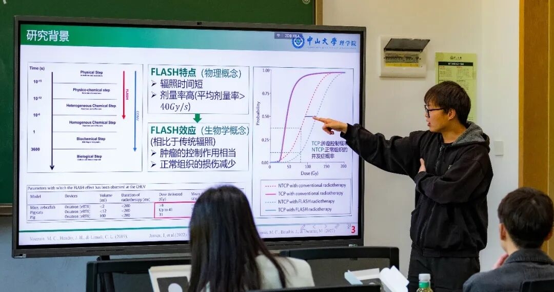 2025级博士研究生黄嘉林则带来《磁控低能电子平台——集成FLASH与空间分次放疗的技术路径》的研究分享。其构建的基于磁控技术的紧凑型低能电子直线加速器平台,成功验证了通过纯电磁控制实现剂量率提升与空间剂量调制的可行性,为FLASH与空间分次放疗的协同研究及临床前验证搭建了可定量调控的物理实验系统。