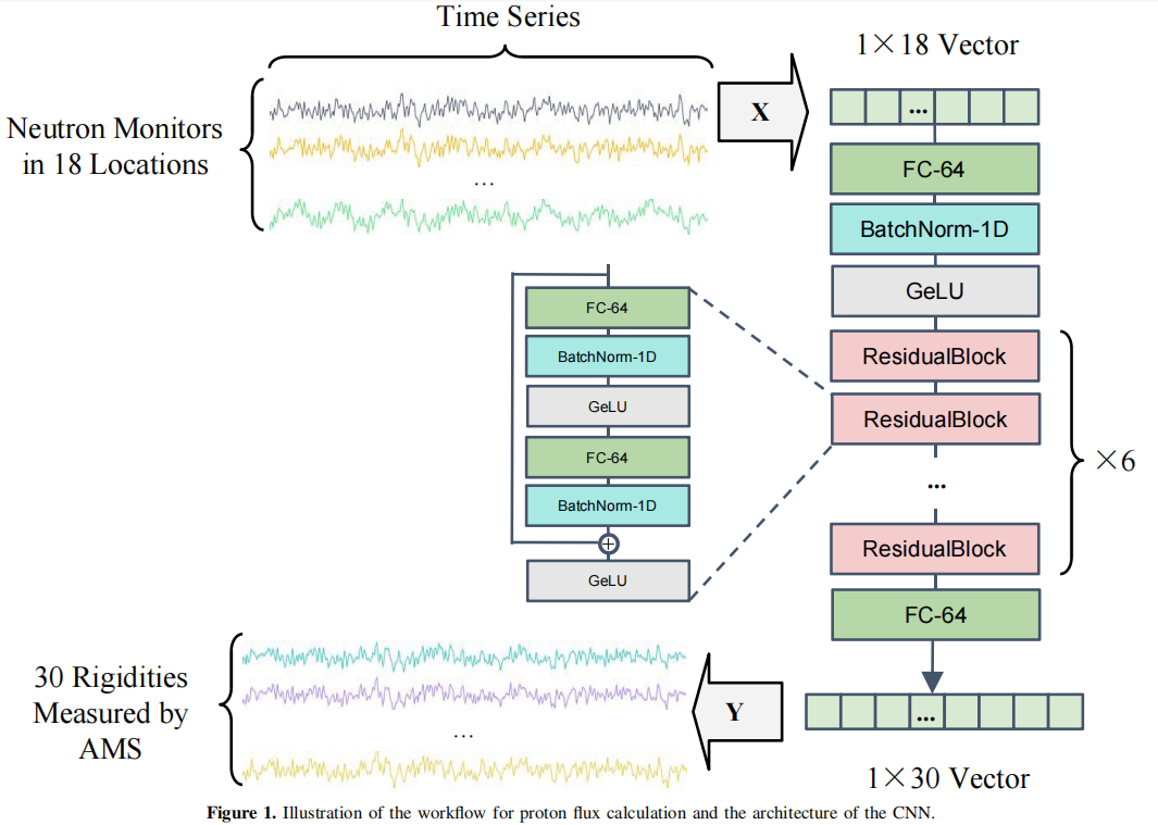 针对这一挑战,研究团队巧妙地将地面中子监测器(NM)的长期、高时间分辨率数据与AMS-02的精确测量相结合。他们首先利用SAITS等先进的时序数据填补算法,处理了全球18个中子监测站数据中的缺失值进而构建了连续、完整的地面观测数据集。随后,团队设计并训练了一个深度残差神经网络模型,从填补后的中子监测站数据中提取特征,学习其与AMS-02测量的质子通量之间的复杂非线性映射关系,模型架构及质子通量计算流程如图 1 所示。