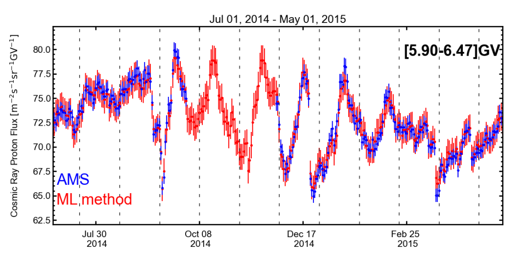 图 2从2014年7月1日到2015年5月1日,磁刚度为[5.90-6.47]GV的宇宙线质子流强流强日变化,机器学习计算(ML method,红)结果与AMS(蓝)直接测量结果对比。虚线作为27天周期的Bartels Rotations的分割线。