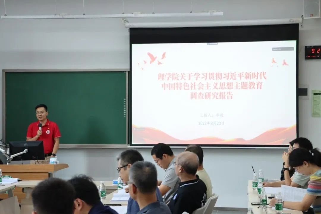 华毅副书记代表学院学习贯彻习近平新时代中国特色社会主义思想主题教育调查研究领导小组汇报了学院主题教育调研成果报告。学院聚焦“以党建为引领,推动深圳校区数学和物理公共课程建设高质量内涵式发展”调研主题,全覆盖深入深圳校区各院系、数学学院(珠海)、物理与天文学院以及散裂中子源科学中心共开展12次调研活动,其中现场调研座谈会11场次、问卷调查208人次。通过深入调研,学院深刻了解深圳校区公共教学存在的实际困难和需求,学习兄弟院系公共课程教学经验。学院将以本次调研为基础,进一步加强青年教师培养、课程建设管理、公共实验室运营管理及立标建制,不断提升公共课程教学和人才培养质量。