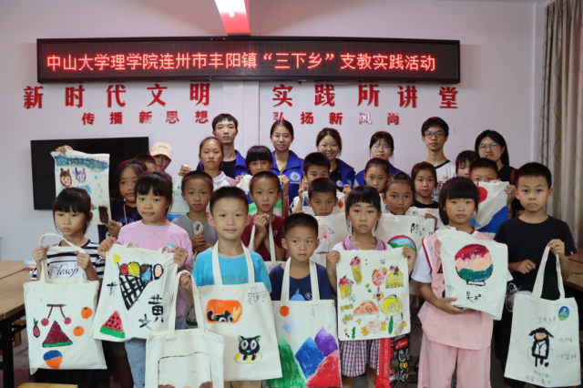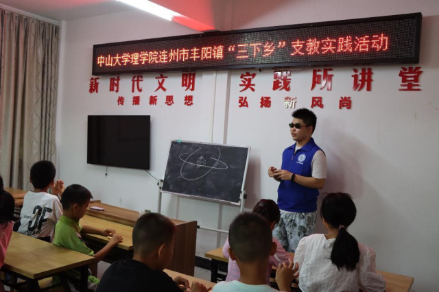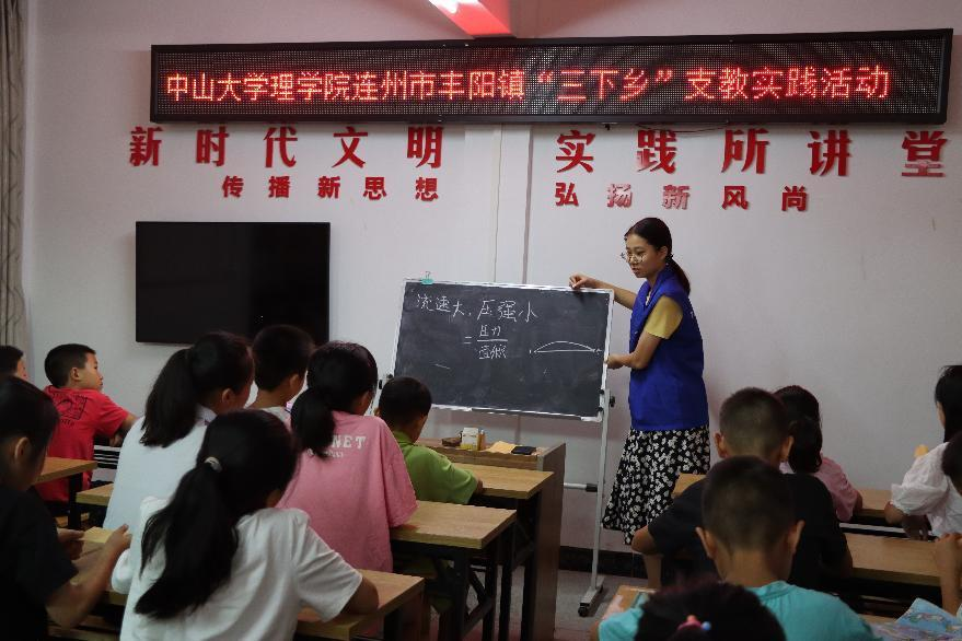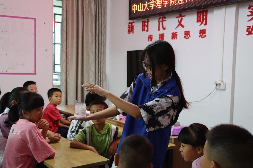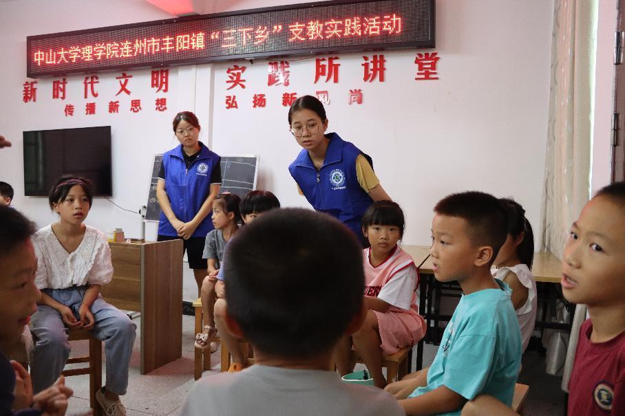 童心向党,逐梦未来。突击队实践团于7月19日在丰阳镇文化站开展公益支教活动,传递知识力量,传播中华优秀传统文化,用青年力量贡献教育帮扶。实践团先给小朋友们带来物理科普实验,分别展示离心运动、密度与浮力、大气压强、流速与压强和静电产生等多个科普实验,邀请小朋友们上台一同尝试,了解实验背后的原理与本质。