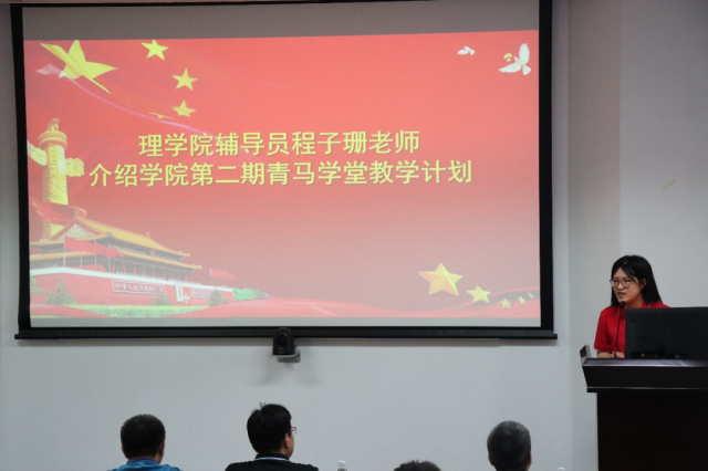 学院团委书记程子珊老师紧接着为同学们介绍了青马学堂课程设置及具体教学安排。本届青马学堂共有三大模块,包括理论学习、红色教育、实践锻炼,并详细向同学们介绍第二期青马班的教学计划。