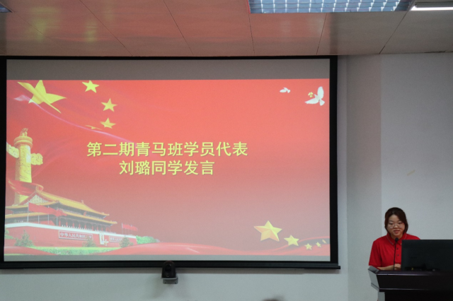 青马班学员代表刘璐同学在会上作了发言。她从自身经历与思考出发,与同学们分享表达了对马克思主义理论学习的热情和成为一名合格党员的期望,她表示将与同学们不断提高自己的思想觉悟,成为中国特色社会主义事业的合格建设者和可靠接班人。