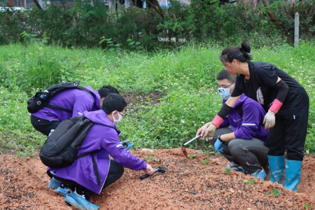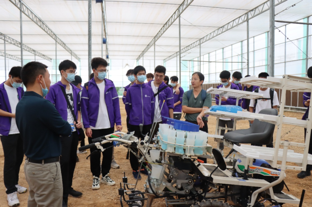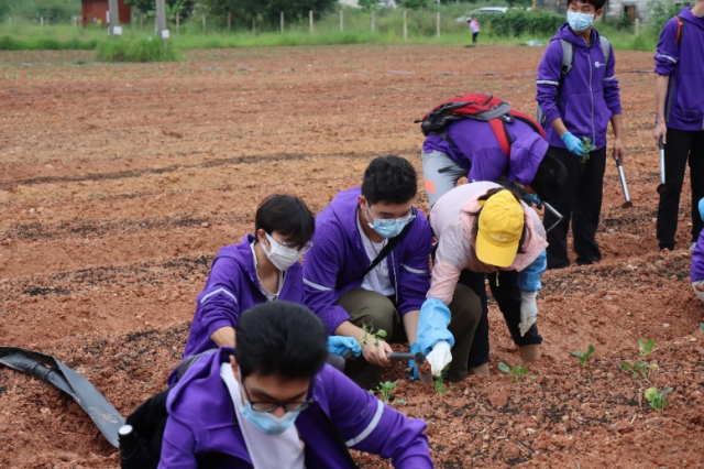 在育种实操结束后同学们集合前往大棚种植基地。大棚种植的培育方式,有利于在台风等极端天气下降低受灾损失。在工作人员指引下,同学们带上手套,用锄头松土、仔细地清理杂物,最后把甜杆西兰幼苗放进土壤,完成盆栽种植。工作人员给同学们介绍了现代化的播种机,初步了解它的工作原理。