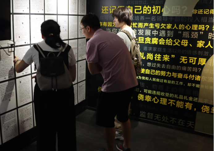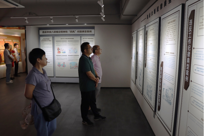 廉政教育基地展厅里,老师们在讲解员的引导下共同观看了“全面从严治党在路上”主题教育宣传片,违反中央八项规定精神和“四风”问题典型案例、教育系统领域违法犯罪典型案例、忏悔实录等,对公职人员特别是教育系统的公职人员“有所为”的红线和“有所不为”的高压线有了更深一层的理解,让教师代表深刻增强纪律意识、规矩意识。