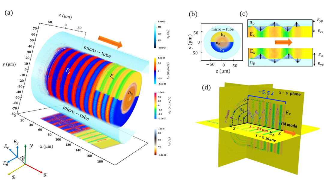 (c) 等离子体微管内壁表面电子膜振荡示意图,由相对论性电子束的横向场Ey p和等离子体中产生的强电荷分离场Ecs驱动;