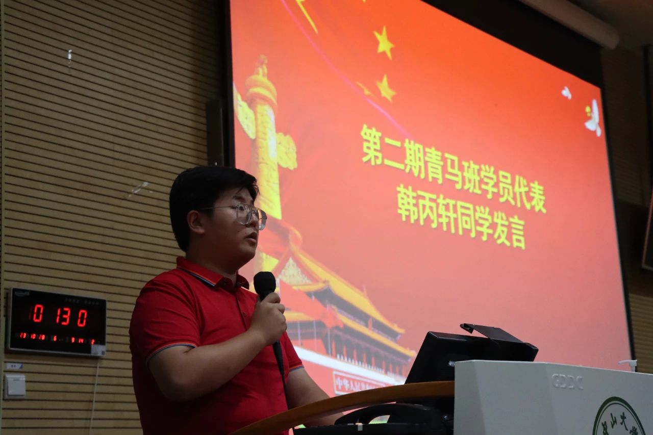 学院第二期青马班学员代表韩丙轩同学发言。他先指出学习马克思主义理论的重要性,理论与实践相辅相成,实践是检验真理的标准,勉励青马班的同学们要坚定理想信念,积极参与社会实践,为中国特色社会主义贡献青春力量。