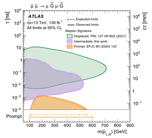 该文章主要介绍了基于 ATLAS 实验 Run-2 阶段数据,寻找产生带有毫米级冲击参数的对称电荷相反的缪子对的新物理现象的研究。该研究未能找到超出标准模型的迹象,因此对长寿命的超缪子质量设定了相应的排除限(图1)。相对于以往的研究,该研究结果极大的扩展了长寿命超缪子的排除限。同时,刘洋助理教授利用“分析可复现化平台”技术,对已发表的ATLAS实验结果进行复用并进行了重新解释,首次填补了即时衰变的超缪子到长寿命超缪子之间的研究空白。