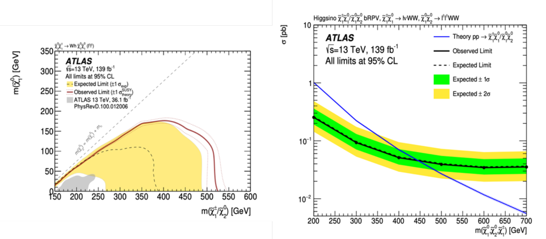 该文章主要介绍了基于ATLAS实验Run-2阶段数据,在同号双轻子或多轻子末态事例中寻找直接产生弱电相互作用的超对称粒子对的研究。该研究显著提高了对超对称模型和其他超出标准模型的过程的敏感性。该研究并未找到超出标准模型的迹象,因此对相应的超对称模型的参数空间做了进一步的限制(图2)。