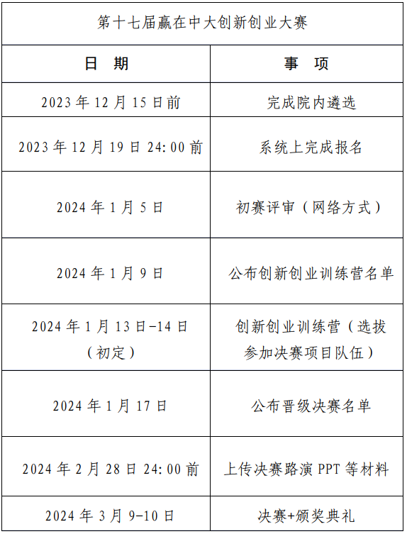 (一)大赛的具体流程、参赛方式、参赛要求、评审规则、申报书及相关表格等参考《第十七届赢在中大创新创业大赛参赛手册》(详见附件)。