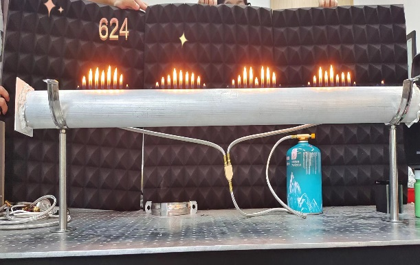 实验开展方面:根据需要设计出管子,材料为铝,画出设计图跟商家定做,再寻找适配的装置零部件,设计搭建实验,进行装置的组装。实验推进过程中,在出现了未加声源时因进气时没有设置减缓气流速度的物质、燃气管喷气导致的压差使气体分布不均匀而导致的火焰不稳定的问题后,通过前后三次改良铝管,调整管长,且从一边进气改为从两边侧面同时进气解决了问题,通过特定的频率获得了明显的声波共振现象;