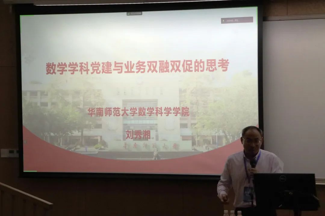 华南师范大学数学科学学院党委刘秀湘书记以《数学学科党建与业务双融双促的思考》为题作专题报告。他提出,只有将党建工作与学科业务相融合,才能够更好地发挥党组织的战斗堡垒作用和党员的先锋模范作用,进一步推动数学学科的发展。刘秀湘书记分享华南师范大学数学科学学院“围绕1个目标、紧抓2个重点、践行3个结合”的工作经验,着力推动党建与业务工作“双融双促”,落实学校重点工作,鼓励党员积极参与学科研究和教学工作,加强党员队伍建设,完善党员教育培训机制,激励党员在学术研究和人才培养方面发挥更大的作用。