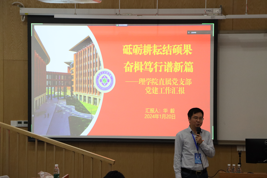 我院直属党支部华毅副书记以《砥砺耕耘结硕果,奋楫笃行谱新篇》为题作专题报告,详细讲述我院全面坚持和加强党的全面领导,抓好党支部自身建设和党员队伍建设,加强学院党风廉政建设,落实全面从严治党主体责任,统筹做好“1+3+N”发展规划。我院直属党支部不断强化党建业务双融合双促进,“一股劲”推动学院事业高质量发展,在人才引育、科研平台建设、学科交叉融合和人才培养质量提升等方面取得不错的成绩。