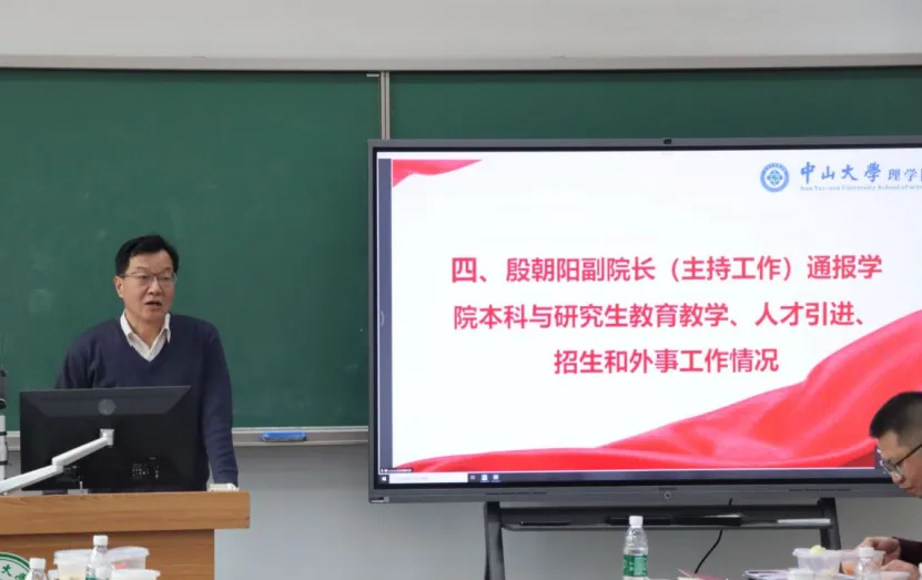殷朝阳副院长(主持工作)向全体教职工介绍了学院人才工作现状及中长期事业发展规划,通报了学院本科教学与研究生教育、人才引进、招生、外事工作情况和学科建设情况,包括学院上学期教育教学审核评估和教学管理工作中的问题及整改落实情况。他强调了学院本科与研究生人才培养、课程建设的相关规定,希望学院教师与学生在课堂内外保持良好交流。他指出,要进一步加强人才引进工作,希望学院教职工“走出去”“引进来”,鼓励教职工积极向学院引荐高水平领军人才,共同为学院师资队伍建设贡献力量。
