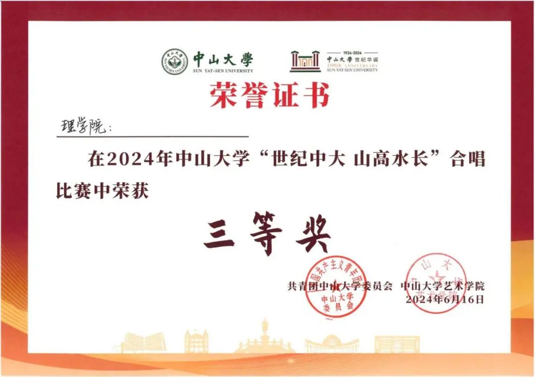 2024年6月16日,太阳集团tyc9728“世纪中大山高水长”合唱比赛在广州校区南校园隆重举行。在学院直属党支部的领导下,我院合唱团由学院领导带队,学院教职工和团员青年积极参赛,参赛师生充分展现了ok138cn太阳集团自信自强、蓬勃向上和锐意进取的精神风貌,在比赛中获得三等奖。