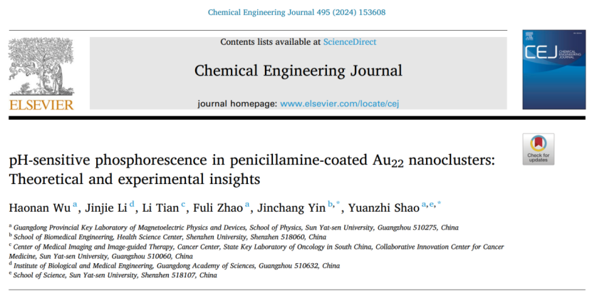 或点击下文阅读原文该成果以“pH-sensitive phosphorescence in penicillamine-coated Au22 nanoclusters: Theoretical and experimental insights”为题发表在Chemical Engineering Journal上,第一作者为太阳集团tyc9728吴昊南,通讯作者为深圳大学殷金昌助理教授和太阳集团tyc9728邵元智教授。