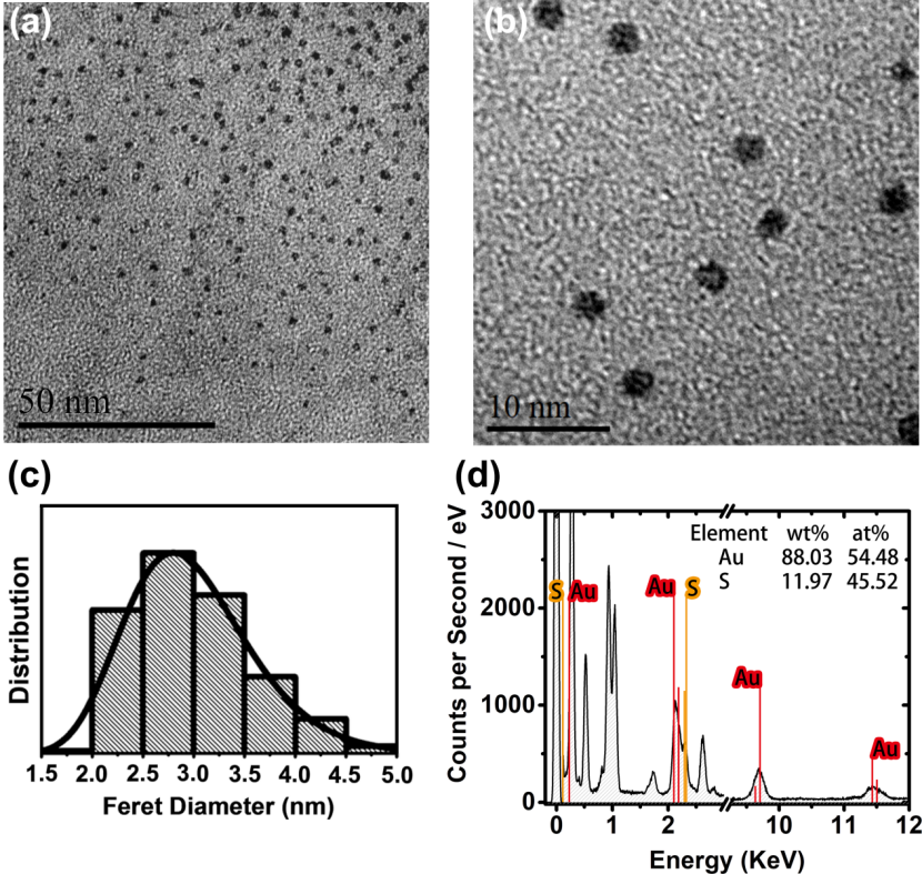 图1. Au22(D-pen)18纳米团簇在透射电子显微镜及其能量散射谱仪(EDS)下的表征结果。(a) Au22(D-pen)18纳米团簇团簇整体电镜照,图中比例尺代表50nm。(b)Au22(D-pen)18纳米团簇局部高倍电镜照,图中比例尺代表10nm。(c)利用ImageJ软件对多张电镜照中纳米金团簇的几何平均费雷特直径(Feret diameter)进行测量和统计的结果柱状图,使用核密度估计(KDE)曲线拟合。(d)对Au22(D-pen)18纳米团簇进行能量散射谱仪测量,红色和棕色分别标记处金原子和硫原子的对应峰位。