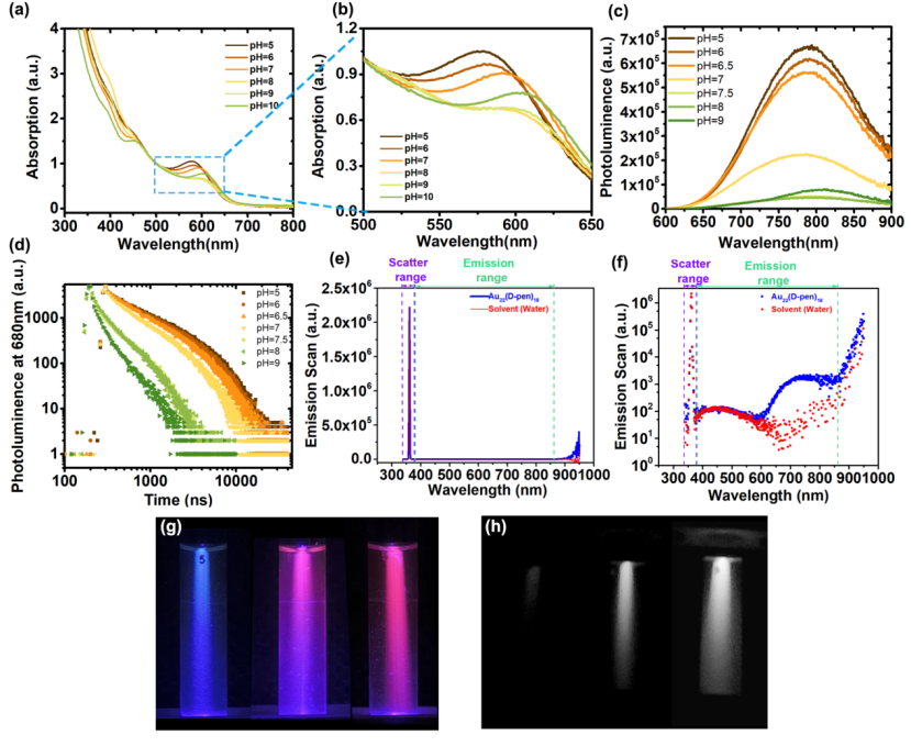 图2. Au22(D-pen)18纳米团簇的光学性能表征。各曲线和散点颜色对应各图图例中的pH值。(a)不同pH值下,Au22(D-pen)18纳米团簇在可见光波段的吸收谱。(b)为(a)中蓝色虚线框的局部放大图。(c)不同pH值下,纳米金团簇在450nm波长激光器的激发下产生的红-近红外磷光强度曲线。(d)不同pH值下,纳米金团簇在450nm波长激光器的激发下产生的磷光强度随时间变化的衰减散点图。(e-f) 量子产率测量结果图,蓝色线和数据散点代表Au22(D-pen)18纳米团簇在入射光的激发后,整个溶液在积分球中出射的光。红色则代表溶剂水的本底信号。图中垂直的紫色虚线和绿色虚线划分出计算光吸收散射以及发射的波长区间。其中,纵轴代表信号强度,(e)是线性坐标而(f)是对数坐标;横轴代表光的波长。(g-h)由400nm激光器激发的,从左到右分别为pH=9,7和5的Au22(D-pen)18纳米团簇溶液照片,(g)为可见光波段相机拍摄,(h)为安装了850nm高通滤光片的近红外一区相机 (850nm-1000nm)拍摄。
