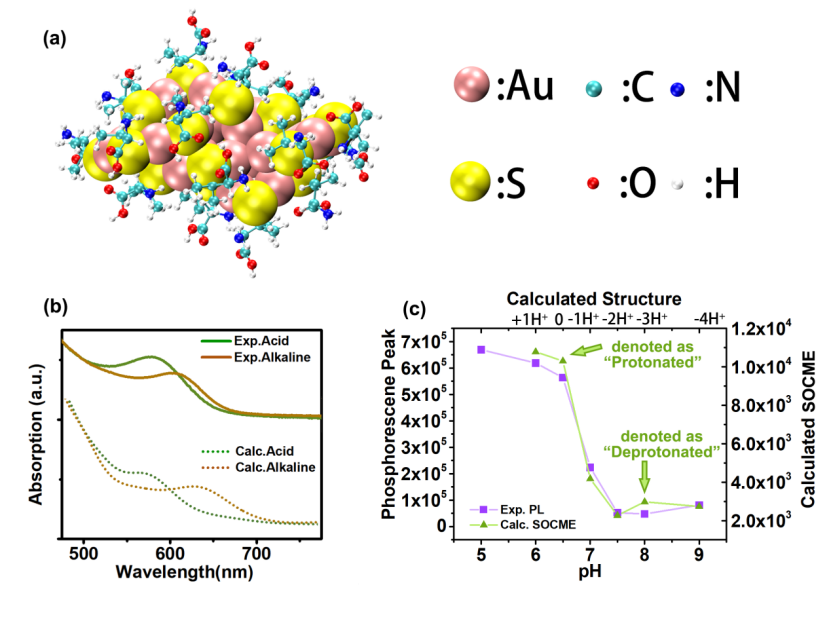 图3. 实验结果与计算结果的比较。(a) Au22(D-pen)18纳米团簇结构,其中金原子和硫原子使用范德华表面展示,配体中的碳、氮、氧、磷均用CPK模型展示。(b)Au22(D-pen)18纳米团簇在酸性环境和碱性环境中的吸收光谱,(c)实验上,680nm处的磷光强度(紫色正方形)和计算的SOCME(绿色三角形)的对比折线图,图中绿色箭头分别指出了下文中将讨论的“质子化结构”(Protonated)和“去质子化结构”(Deprotonated)。
