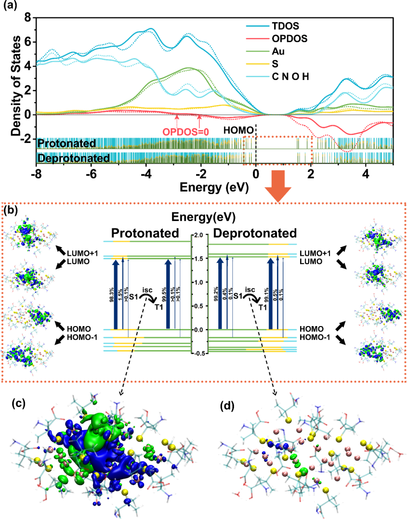 图4. (a) 质子化和去质子化结构的态密度(DOS)图(对应较大和较小SOCME)。实线和点曲线分别显示了质子化和去质子化结构中的DOS与能量的关系。曲线下方的短垂直线表示每个分子轨道的能量和组成。DOS图以两种结构的各分子轨道相对于HOMO的能量重新排列以方便对比。蓝色、红色、绿色、黄色和天蓝色对应于总密度、重叠密度、金原子的贡献、硫原子的贡献以及其余元素的贡献。实线中的红色箭头和点标出了OPDOS=0的分界点。(b)两种结构中S1和T1的激发态组态标记在分子轨道上(分子轨道的颜色标注与(a)中一样)。从HOMO-1到LUMO+1之间的前线轨道绘制在图的两侧。(c&d)在 Au22(D-pen)18纳米团簇的质子化(c)和去质子化的(d)结构模型上绘制的S1和T1之间的电荷密度差的等值面。等值面设置为0.00002原子单位。蓝色和绿色等值面分别对应从S1到T1的系间窜越过程中,电子密度的降低和增加。金原子和硫原子以CPK形式绘制,其余配体以透明棒形式绘制。