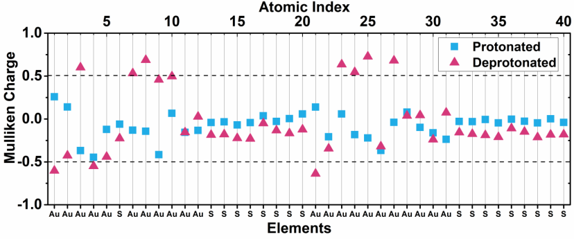 图5. 质子化(蓝色正方形)和去质子化的(红色三角形)结构的Au22(D-pen)18纳米团簇中的核原子(金和硫)上的基态马利肯电荷分布。垂直线将体系内原子的标号与每个原子的元素相对应。水平虚线标出±0.5马利肯电荷。对于金原子和硫原子形成的核心而言,一些金原子在去质子化结构中具有相对较大的净电荷(>0.5),而质子化的结构将所有净电荷保持在±0.5以内。此外,与质子化的结构相比,去质子化结构中的硫原子带的负电荷相对更多。