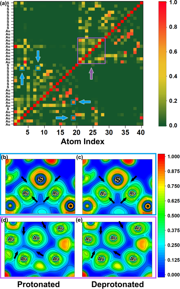 图6. Mayer键级矩阵和电子定域化函数(ELF)的等值线热图。(a) Mayer键级矩阵。热图上的每个色块对应于由其横轴和纵轴对应标号的两个原子之间的Mayer键级。热图的左上半部分和右下半部分分别显示了去质子化和质子化结构的Mayer键顺序。沿着对角线红线对称排列的一对色块对应于每个结构中的一个化学键。(b-c)围绕19号硫原子及3号和8号的相邻金原子的ELF等值热图,其中(b)是质子化结构的一部分,(c)是去质子化的结构的一部份。(d-e)21号、23号、24号、25号和27号的金原子周围的ELF等值线热图。其中(d)是质子化结构的一部分,(e)是去质子化的结构的一部份。