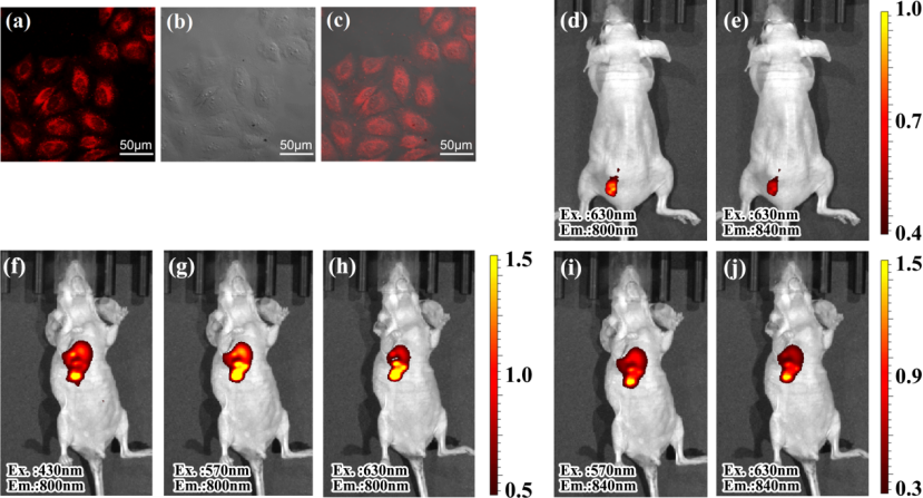 图7. (a-c):利用共聚焦激光扫描显微镜,对在含有Au22(D-pen)18纳米团簇溶液培养基中的培养的肿瘤细胞进行成像。图像大小为212.13微米×212.13微米,比例尺标记为50微米。激发光为405nm激光,(a)是发射光为600nm以上波长的红光与近红外光,(b)是可见光明场图像。(c)是(a)和(b)的叠加图像。(d-j):在不同的激发和NIR扫描波长下(在每个图像中分别记为为Ex.和Em.),荷瘤小鼠的明场和近红外一区信号图像的叠加。颜色表示测量得到的近红外发射的辐射效率,与磷光强度成正比。