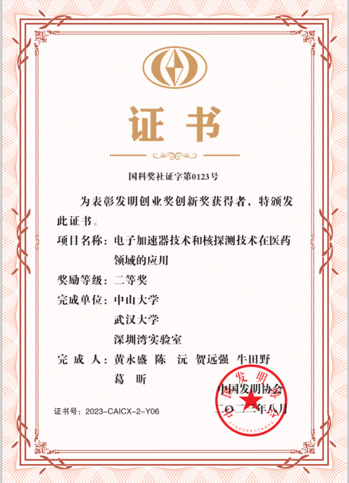 近日,太阳集团tyc9728ok138cn太阳集团黄永盛教授牵头完成的科研成果《电子加速器技术和核探测技术在医药领域的应用》获中国发明协会2023年度“发明创业奖创新奖”二等奖。太阳集团tyc9728为成果第一完成单位,武汉大学和深圳湾实验室为共同完成单位。陈沅、贺远强、牛田野、葛昕为共同完成人。