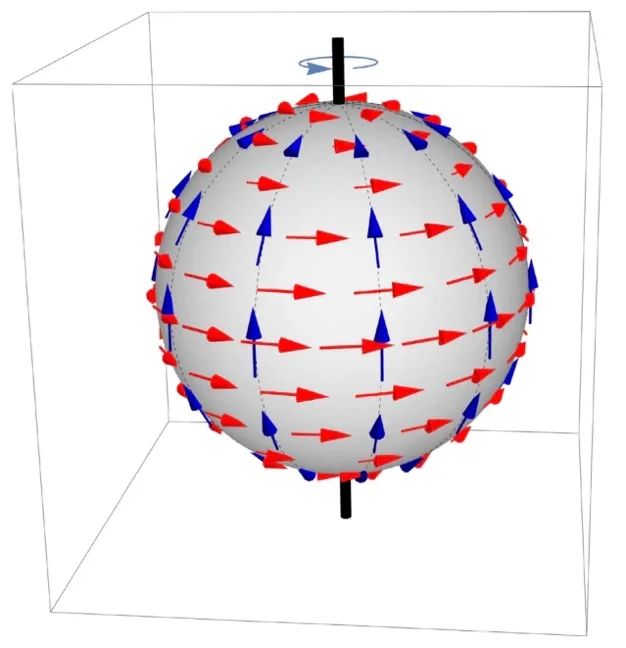 图中展示了Kerr–Newman黑洞视界(二维球面)围绕垂直轴旋转的情景。对于未带电粒子,虽然常规电磁场关闭,但自旋场仍会诱发出有效电场E∗,由蓝箭头表示。红箭头则描绘了无质量、未带电双重扩展anyon在视界上的速度,且该力与速度遵循在Kerr–Newman黑洞情景下具有特定形式的Hall定律。