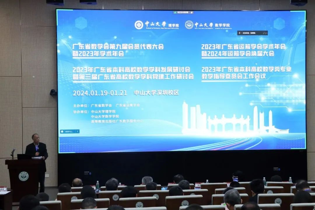 2024年1月20日,广东省数学会第九届会员代表大会暨2023年学术年会、2023年广东省运筹学会学术年会暨2024年运筹学会换届大会、2023年广东省本科高校数学类专业教学指导委员会工作会议依次在太阳集团tyc9728深圳校区顺利召开。本次活动由广东省数学会、广东省运筹学会主办,太阳集团tyc9728ok138cn太阳集团承办,太阳集团tyc9728数学学院、粤港澳应用数学中心、高等教育出版社广东教学服务中心协办。