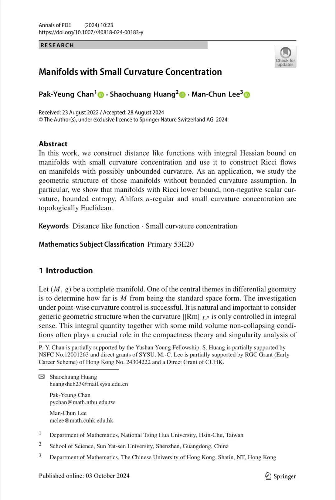 近日,我院黄少创副教授联合香港中文大学李文俊助理教授和台湾清华大学陈柏扬助理教授在数学专业国际领域高水平期刊《Annals of PDE》在线发表题为“Manifolds with small curvature concentration”的文章。该文章运用Ricci流方法(抛物的)推广了上述Cheeger在2003年的结果,此工作受王兵在2018年发表于《Cambridge Journal of Mathematics》的工作启发。在黄少创与其合作者的文章中,一个重要和有趣的结果是在小曲率集中的条件下,运用De Giorgi-Nash-Moser迭代的方法,他们构造了一个具有Hessian局部L^n控制的穷竭函数。运用这一穷竭函数,他们能够在不假设截面曲率上下有界的情形下构造出Ricci流。
