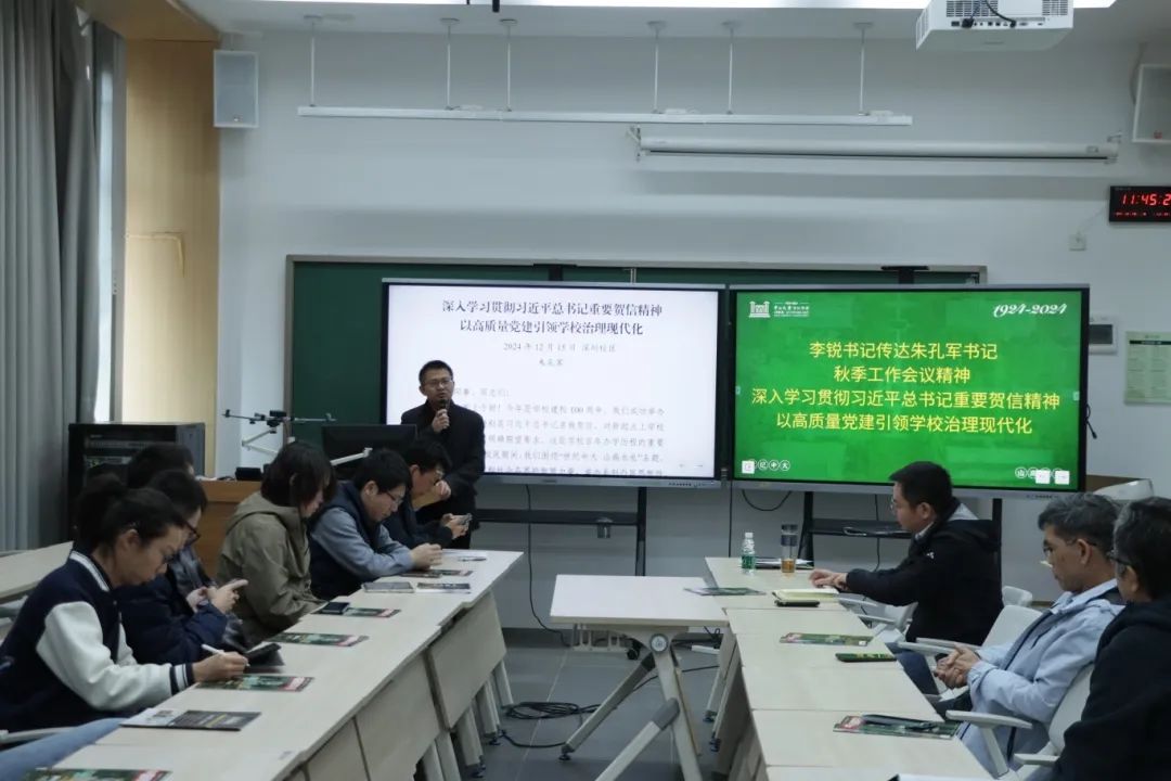 李锐书记传达了朱孔军书记《深入学习贯彻习近平总书记重要贺信精神 以高质量党建引领学校治理现代化》的报告。朱孔军书记在大会上强调,要以习近平总书记重要贺信精神为指引,从深化改革推进学校治理现代化谋篇布局,紧紧围绕“一体推进”抓学校治理体系和治理能力建设,以高质量党建引领学校治理现代化,加快建设中国特色世界一流大学,并围绕推动实现发展目标对下一步工作提出五点具体要求,努力实现学校“由大到强”的系统性跃升。
