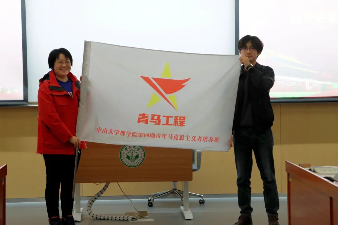 校党委组织部专职组织员(副处级)郑平老师为第四期青马学堂授旗。