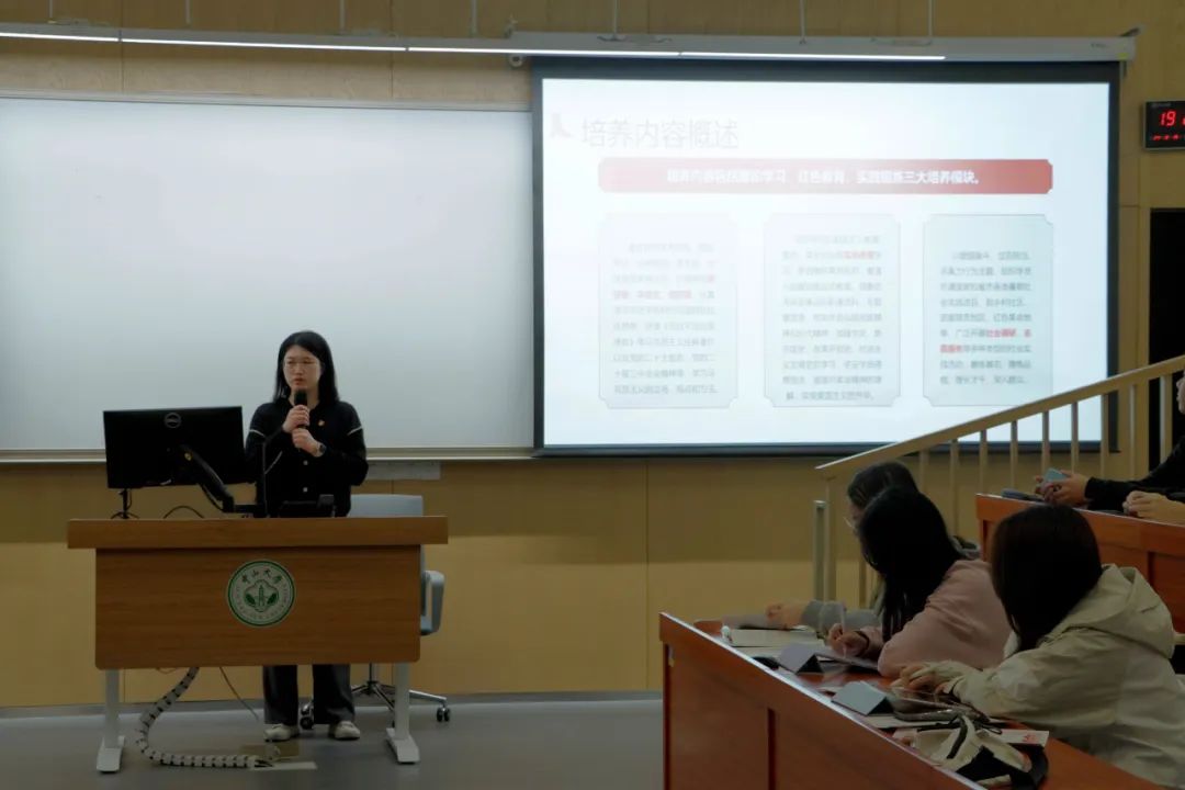 指导老师程子珊介绍第四期青马学堂课程培养体系。程子珊老师分别从培养内容、教学计划和考核方式三个方面进行讲解,主要包括理论学习、红色教育与实践锻炼三大培养模块。