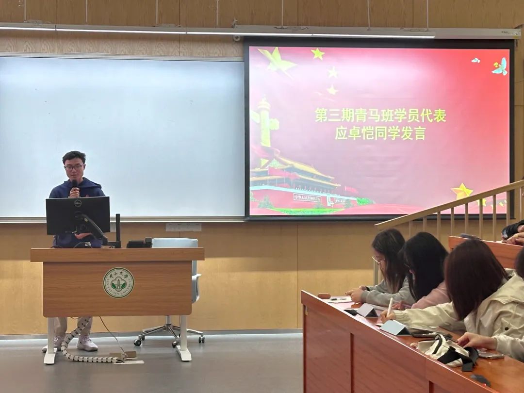 学院第三期青马学堂学员代表应卓恺同学发言。他通过理论学习、外出参观、志愿服务与社会实践四个方面向学员们分享了自己在学院青马学堂培养下得到的收获,并勉励同学们传承优秀品质、发扬奋斗精神,继续坚持学习党的理论思想,努力为国家、社会作出贡献。