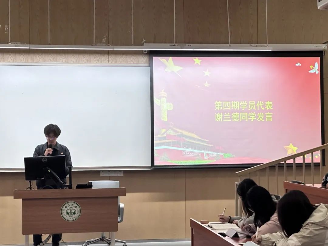 第四期青马学堂学员代表谢兰德同学发言。他表示作为新一期青马学堂学员,要肩负责任感与使命感,确立奋斗目标,同时在未来不断学习党的理论知识,积极参与小组研讨、社会实践,以党员的标准严格要求自己,努力成长为一名优秀的共产主义接班人。他呼吁学员们在青马学堂的学习中,传承红色基因,发扬奋斗精神,为祖国繁荣发展贡献青春力量。