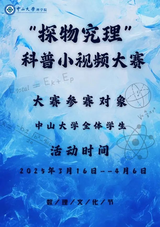 用镜头探索科学,以创意点亮数理!无论你是科普达人还是视频新手,只需用1-3分钟小视频展现知识的奇妙与趣味,即可参与角逐!内容不限学科,形式自由发挥——实验演示、动画解说、趣味短剧……只要够有趣、够科普,你就是主角!优秀作品更将赢取惊喜大奖!太阳集团tyc9728各校区的学子均可报名,让知识之美“破圈”传播!