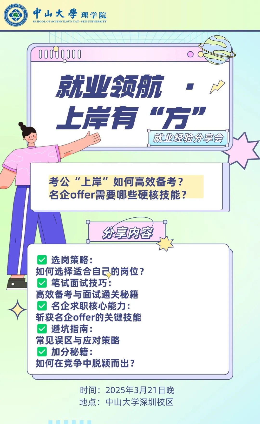 考公“上岸”如何高效备考?名企offer需要哪些硬核技能?本次就业分享会特邀优秀的师兄师姐,为你揭秘就业赛道的实战经验!从选岗策略、笔试面试技巧到名企求职核心能力,学长学姐将倾囊相授“避坑指南”与“加分秘籍”。现场互动答疑,助你理清方向、突破瓶颈,在职业起跑线上快人一步!