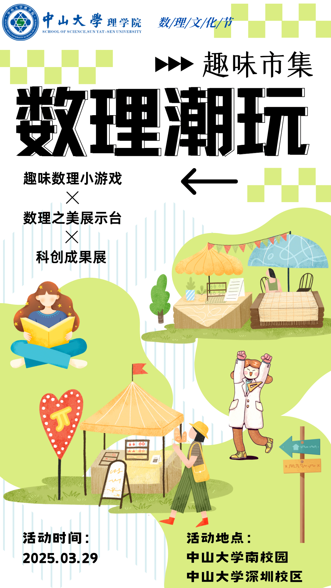 欢迎来到一场融合知识与趣味的盛宴!活动设有小游戏摆摊、科创成果展、数理之美展示台等。在这里,你可以与朋友们一起挑战各种数理小游戏,赢取精美奖品;数理之美展示台欢迎各学院加盟,一起展示学院独特魅力和学子们的科创成果,让我们一起探索数理世界的奥秘吧!
