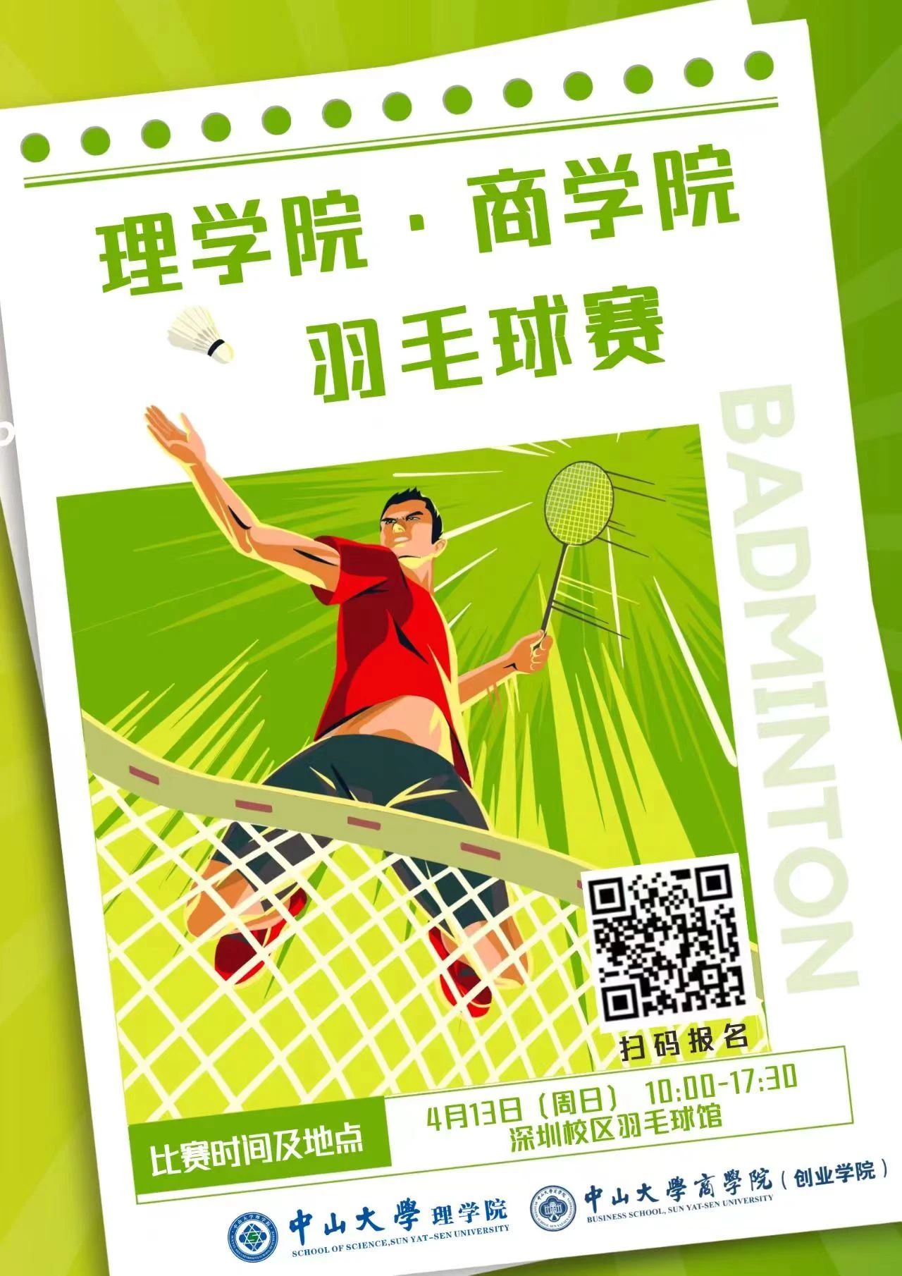 让我们共同期待这场力与美的碰撞,见证属于理学和商才的荣耀时刻!你的每一次跃起扣杀都值得被记录,这个春天,让羽毛球划出的弧线成为校园最美的风景线!