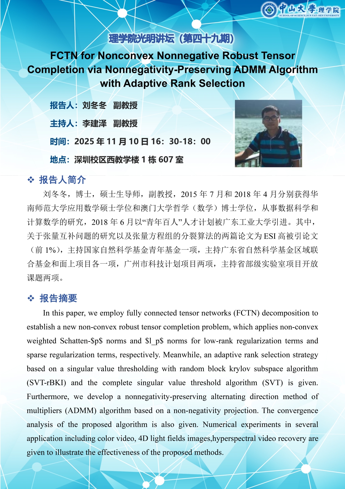 光明讲坛(第49期):FCTN for Nonconvex Nonnegative Robust Tensor Completion via Nonnegativity-Preserving ADMM Algorithm with Adaptive Rank Selection